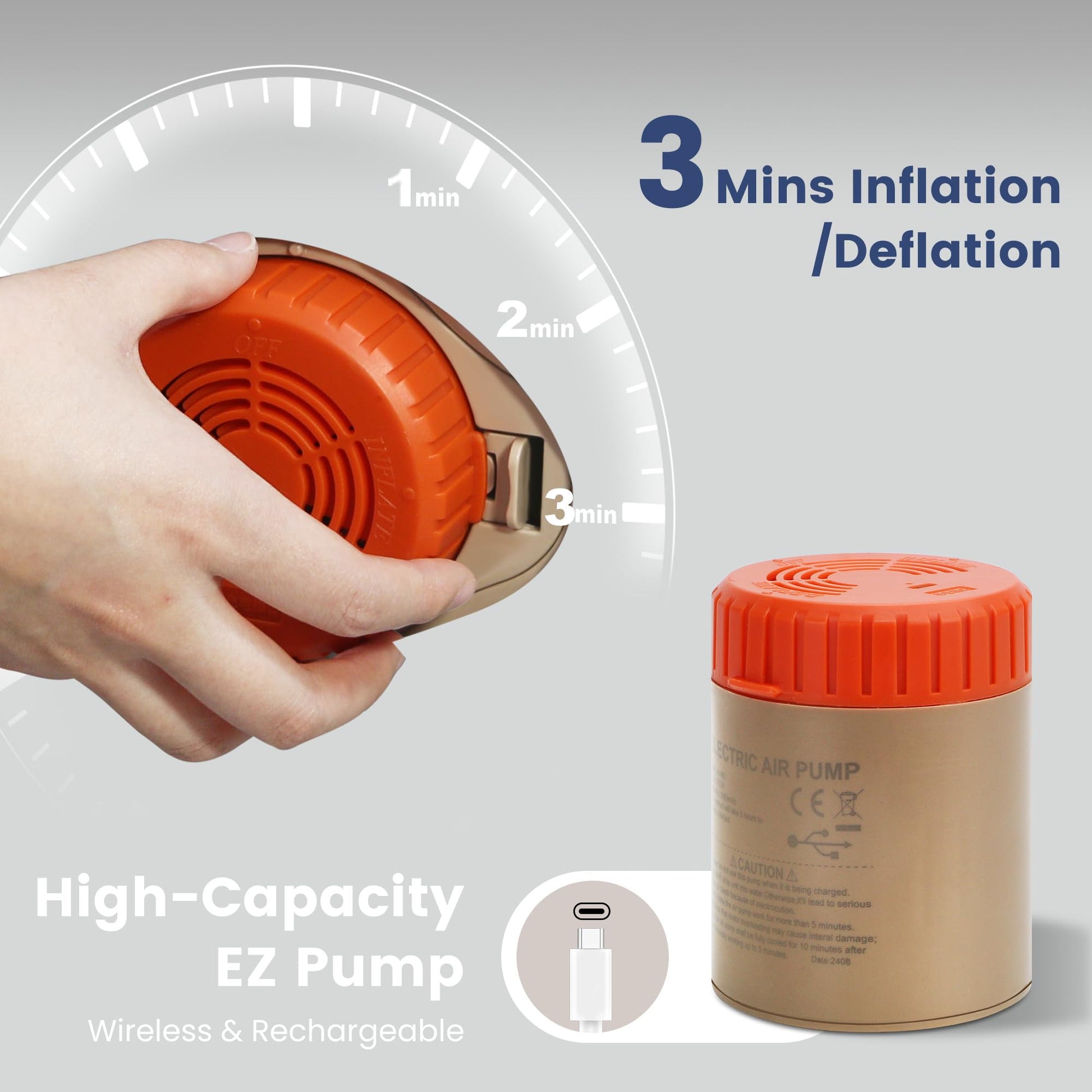 • Cordless Pump (USB-Rechargeable): No outlets needed! Charge the pump with the USB cable and inflate anywhere. The detachable design offers ultimate portability for camping, travel, or guests.