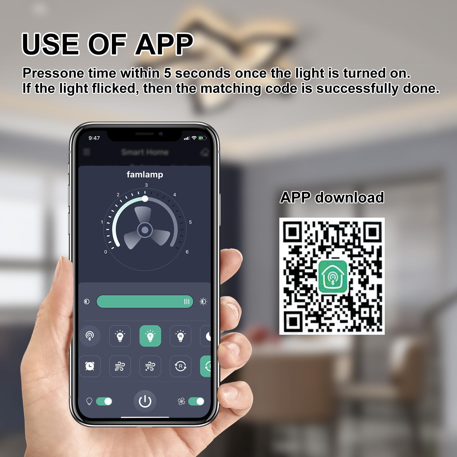 • [Timing function] The ceiling fan has 6 gear speeds, and you can choose the 1-2 speed (slow wind), the 3-4 speed (medium speed wind), and the 5-6 speed (fast wind) according to your needs.If you feel that running a fan all night while you sleep is bad for your health, then our timer feature can help you with that problem. You can set the time through the remote control or mobile app, no matter how long the time is.