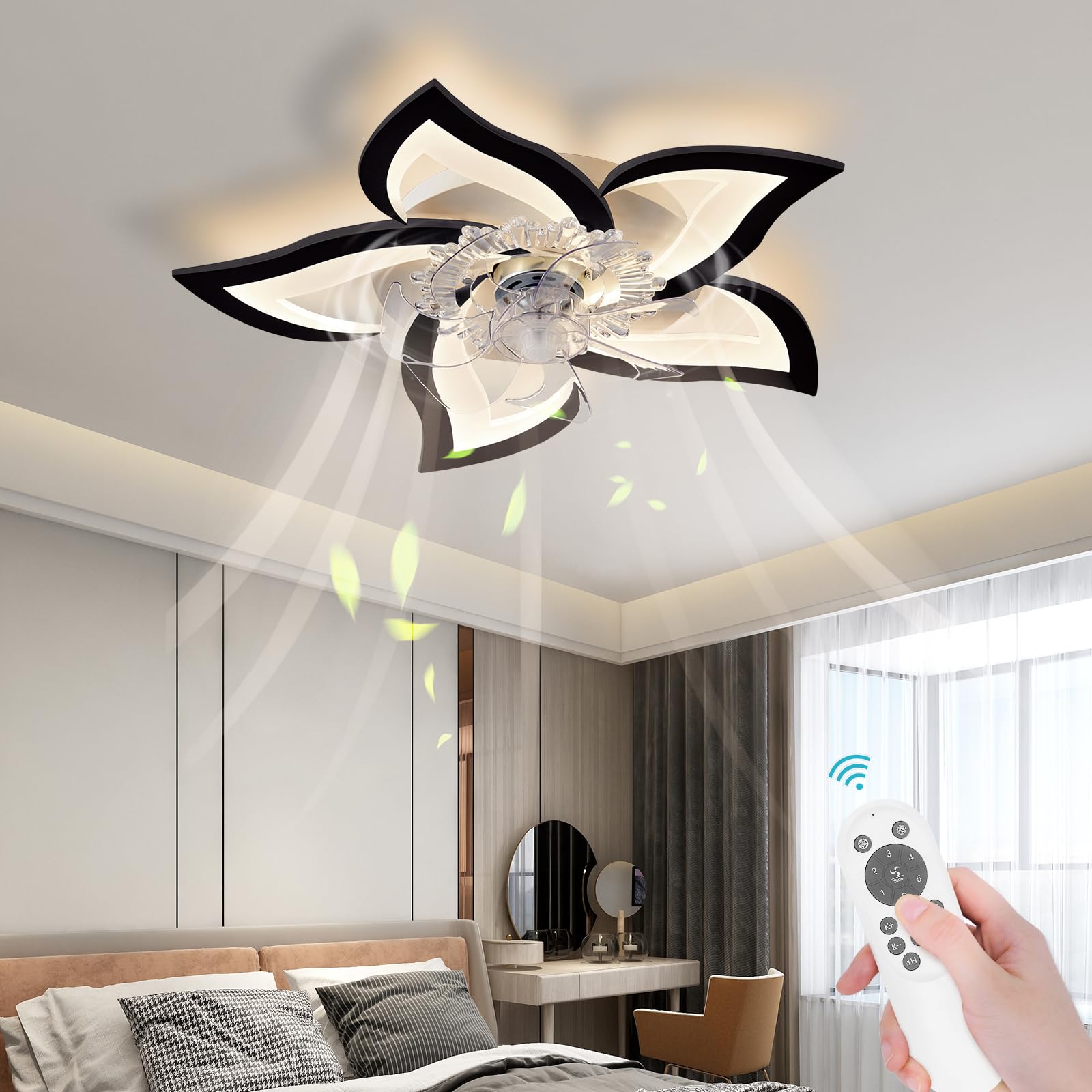 • [Wide application] Ceiling fans with lights adopts modern creative petal design, with a 6 gear fan suitable for 8-15 ㎡ living room, bedroom, dining room, study room,etc.