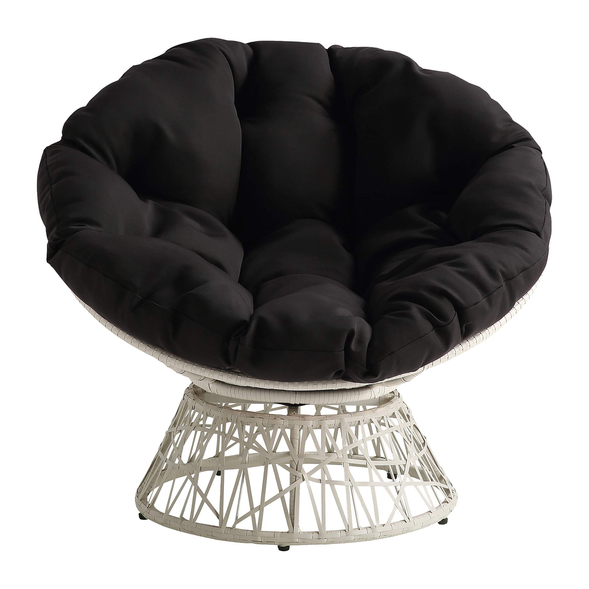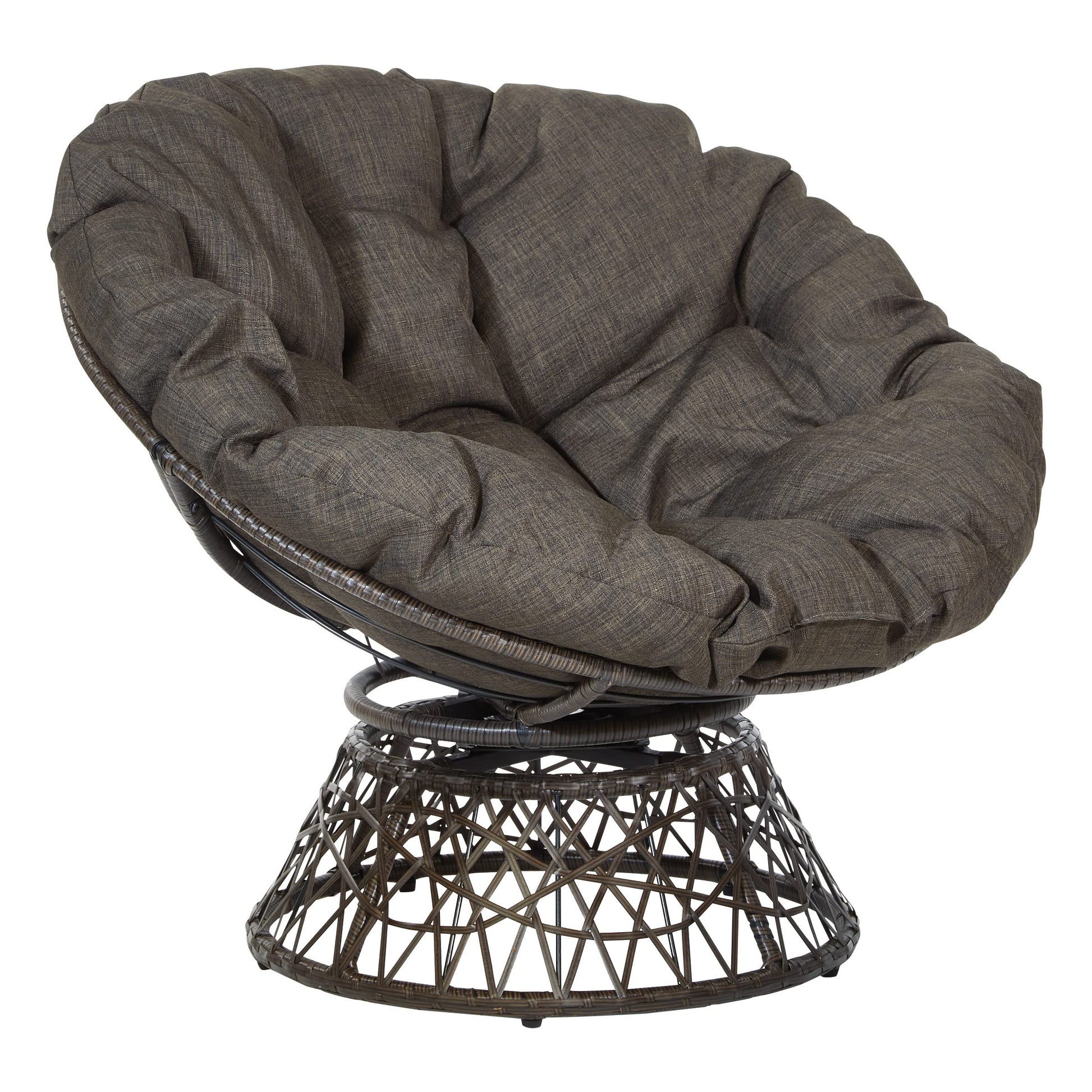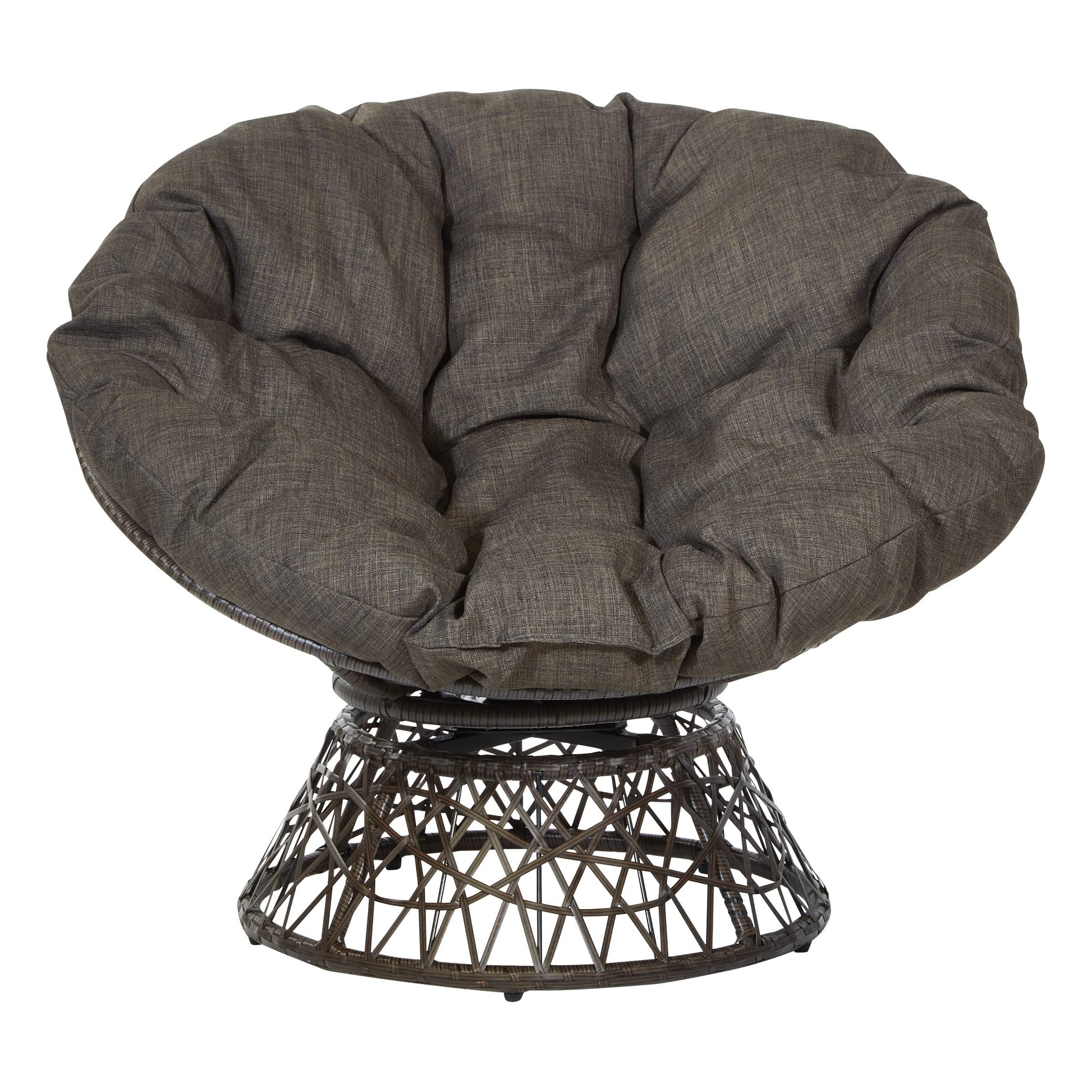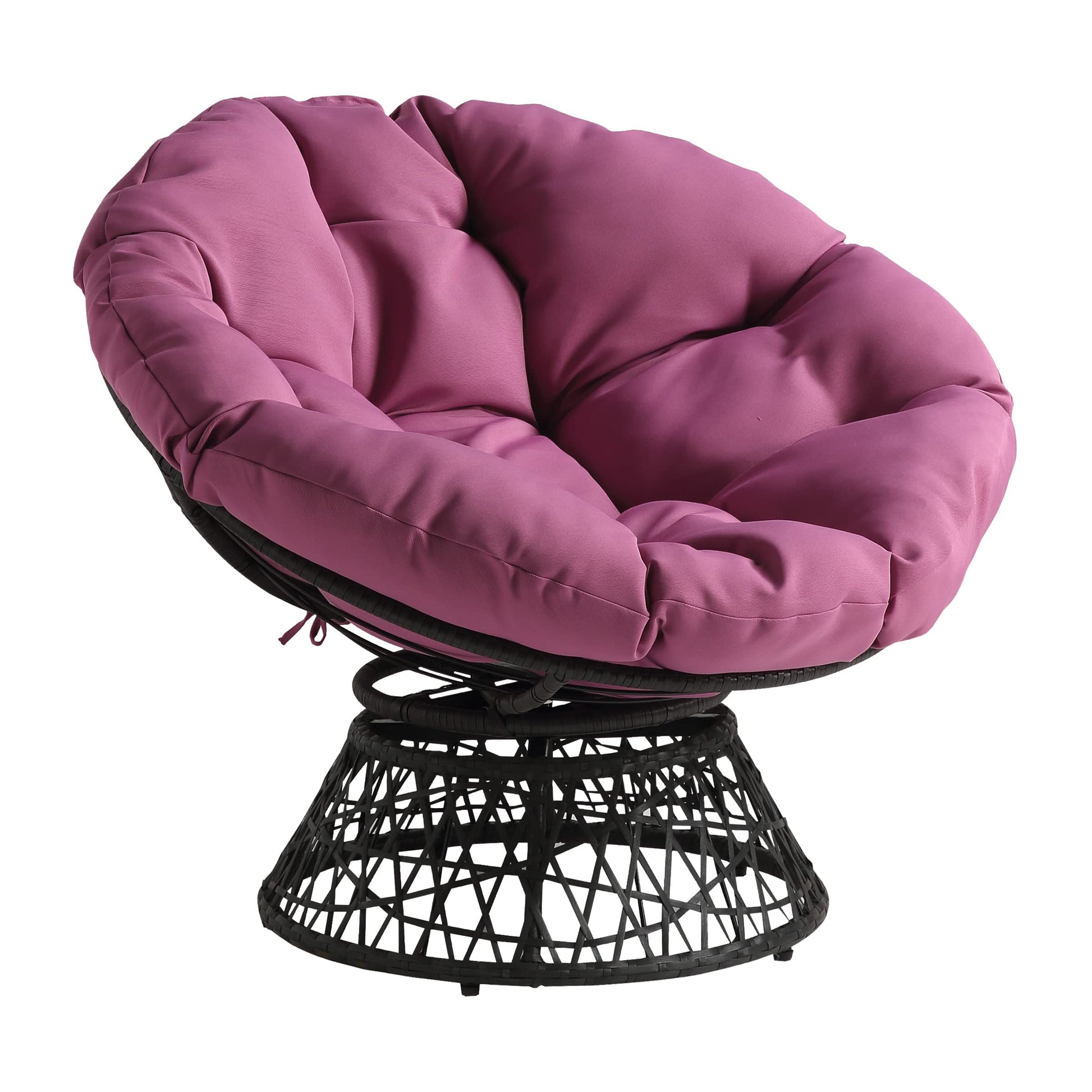 Create a laid back vibe in your home with our twist on the classic papasan chair design. Nest into the generously large Dacron-filled cushion. Enjoy the boho styling of our durable resin wicker wrapped over a metal frame. Complete with a 360° swivel to twist and turn to your heart’s content. Tune in to a time when listening to your favorite albums and sipping on a cool, refreshing drink was your only ambition for the day. Add a bit of fun to your living room, family room or dorm with our easy, casual Papasan Chair. Available in several exciting colors and finishes. Durable, well built and just plain fun!