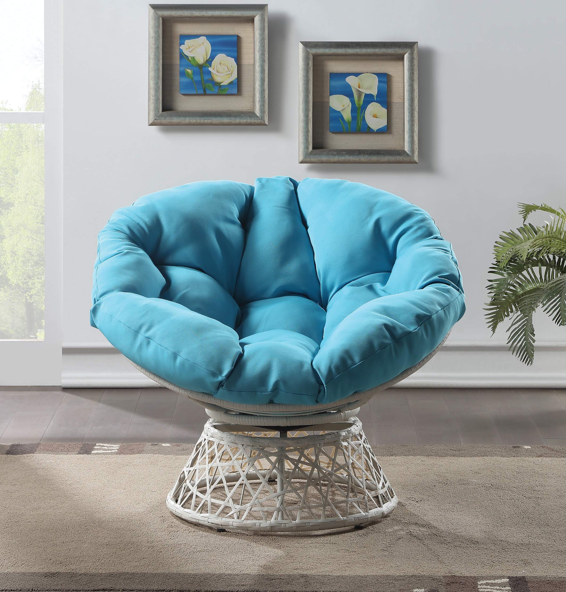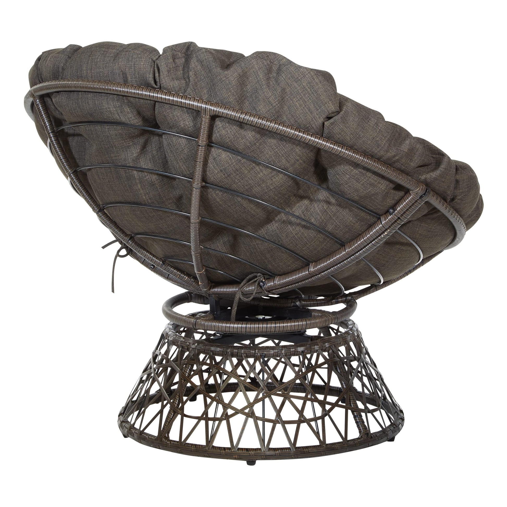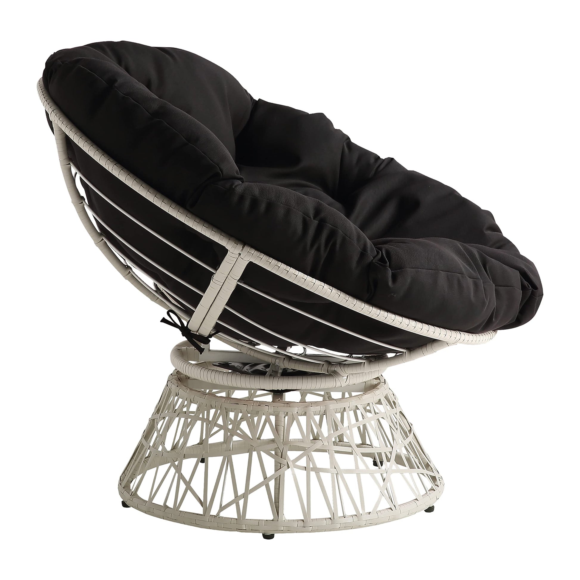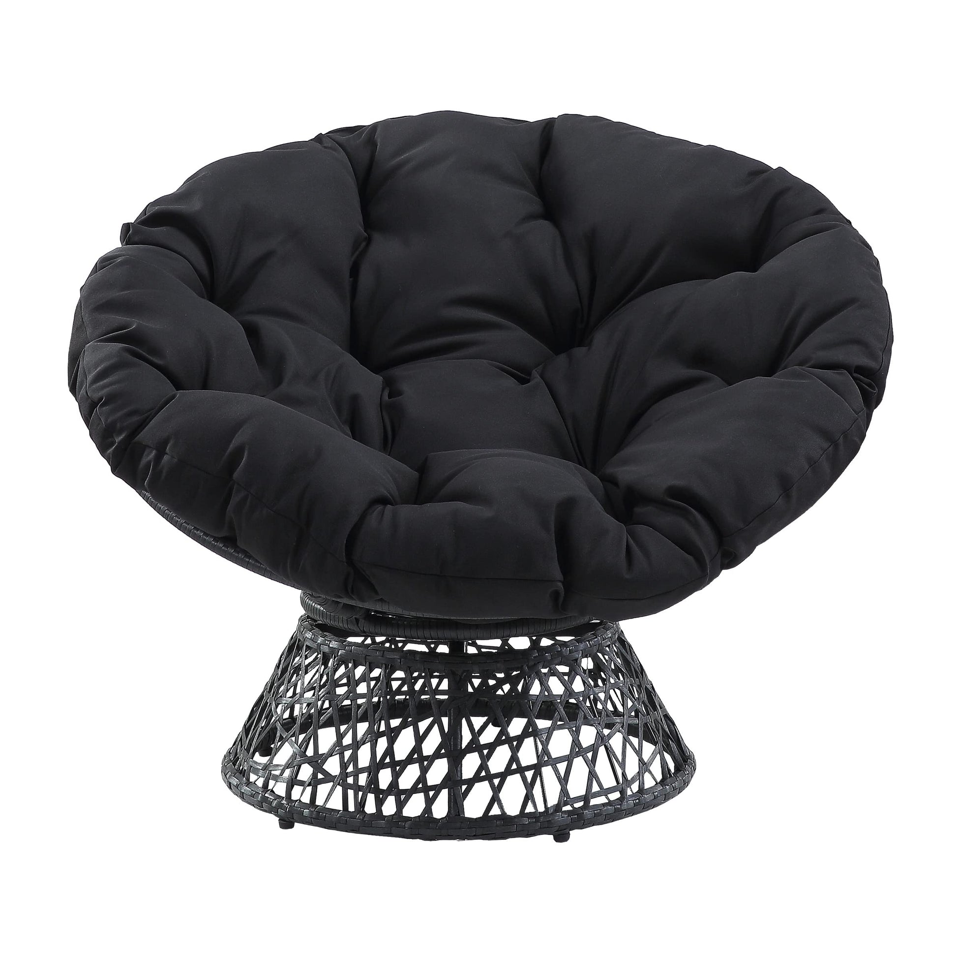 Create a laid back vibe in your home with our twist on the classic papasan chair design. Nest into the generously large Dacron-filled cushion. Enjoy the boho styling of our durable resin wicker wrapped over a metal frame. Complete with a 360° swivel to twist and turn to your heart’s content. Tune in to a time when listening to your favorite albums and sipping on a cool, refreshing drink was your only ambition for the day. Add a bit of fun to your living room, family room or dorm with our easy, casual Papasan Chair. Available in several exciting colors and finishes. Durable, well built and just plain fun!