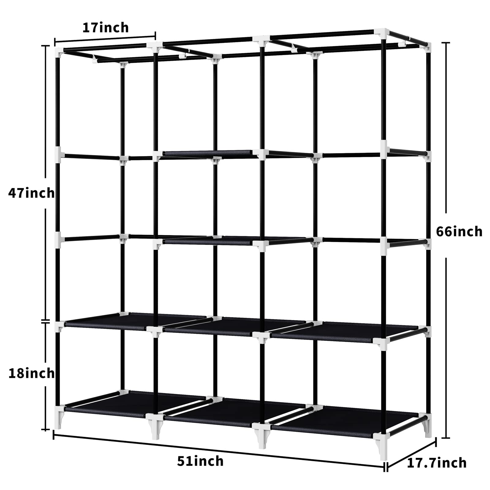 • SPACIOUS STORAGE SPACE:A total size of portable wardrobe is 51"L x 17.7"W x 66"H, It’s suitable for you to organize clothes of your small room, cloakroom, clothing store, It will offer you large storage space for your Long-Term storage needs.