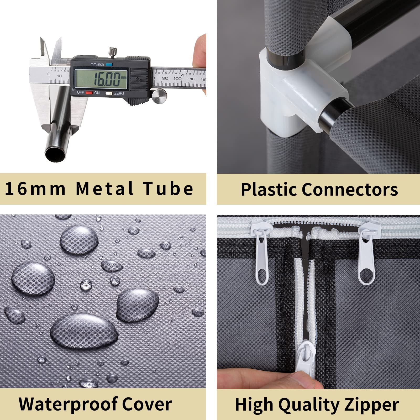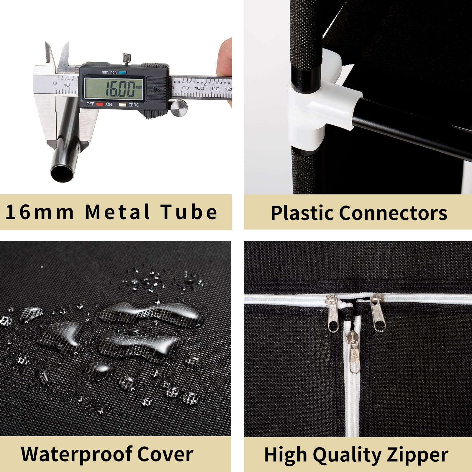 • STURDY STRUCTURE: The portable wardrobe closet selects 16mm diameter round tube and PP plastic connector with a non-woven fabric zipper cover, It is very strong to bear heavy weight. The frame is stable and not easy to bend, ensuring long-lasting use.